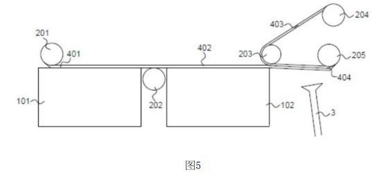 貼合輥203,設(shè)于清洗槽的尾端上方,清洗液的上表面與貼合輥底部之間的間隙不大于多層石墨烯薄膜與目標(biāo)基底的厚度之和。當(dāng)貼合輥旋轉(zhuǎn)時(shí),會(huì)將目標(biāo)基底卷到多層石墨烯薄膜的上表面,借助摩擦力將目標(biāo)基底與多層石墨烯薄膜貼合,得到石墨烯薄膜包裹的電化學(xué)陽極404;