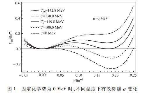 為了更加準(zhǔn)確地描述夸克-膠子等離子體(Quark-Gluon plasma,QGP)與強(qiáng)子物質(zhì)之間的相變特征,在溫度密度有限的情況下,通過(guò)嚴(yán)格的數(shù)值方法,固定化學(xué)勢(shì)為μ=0 MeV,作出如下有效勢(shì)Veff隨σ場(chǎng)變化的函數(shù)關(guān)系圖像。其中,由上至下曲線的溫度依次設(shè)定為T=142.8,130.0,119.8,100.0以及0 MeV.如圖所示,在溫度相對(duì)較低時(shí),每條勢(shì)能曲線都具有兩個(gè)極小值和一個(gè)極大值,一個(gè)極小值位于σ較小的σ0處,另一個(gè)極小值位于σ較大的σv處,其間存在一個(gè)局域極大值,對(duì)應(yīng)兩極小值之間存在的勢(shì)壘。
