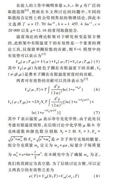 本文具體采用的模型是具有夸克禁閉性質(zhì)的Friedberg-Lee模型(F-L Model)。F-L模型最初用于描述低能時(shí)強(qiáng)子的行為,將強(qiáng)子看做真空中的袋狀孤子解,為QCD理論中的禁閉行為提供了非常直觀的物理解釋。不僅如此,該模型也被擴(kuò)展至有限溫度密度下夸克物質(zhì)的退禁閉相變的研究,提供了研究夸克強(qiáng)子相變性質(zhì)的有利手段。但是該模型只能給出有限溫度密度下夸克物質(zhì)一級(jí)相變的結(jié)果,無(wú)法討論平滑過(guò)渡(Crossover)相變和相臨界截點(diǎn)相關(guān)的物理問(wèn)題,具有一定局限性。不過(guò)本文主要研究夸克強(qiáng)子一級(jí)相變下氣泡或液滴的動(dòng)力學(xué)問(wèn)題,F(xiàn)-L模型是比較合適的模型。