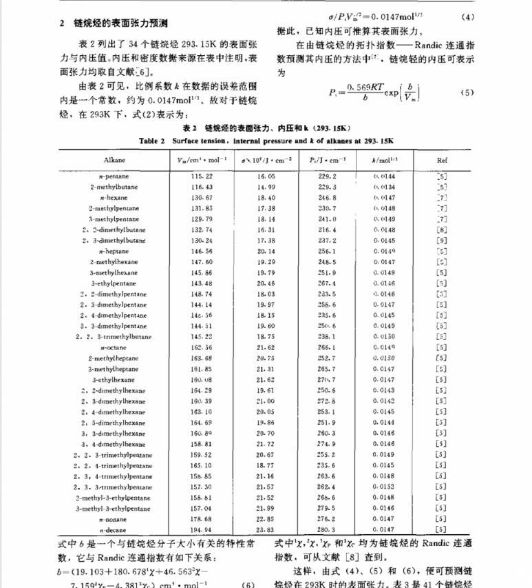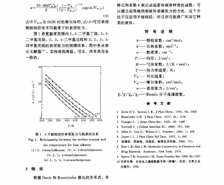 對(duì)Davis和Rosseinsky提出的關(guān)系檢驗(yàn)表明,液體的表面張力σ與P1Vm1/3之比不僅取決于溫度,還與液體的種類有關(guān),據(jù)此,建立了一個(gè)能由鏈烷烴的分子結(jié)構(gòu)準(zhǔn)確預(yù)測(cè)其表面張力的方法。