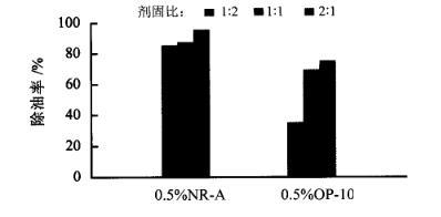 從圖2的脫附除油率來看,當納米乳液濃度在0.5%時,除油效果最佳,脫附除油率達到95.7%;當納米乳液濃度達到5%時,脫附除油下降一半,說明濃度過高的納米乳液反而降低了它的脫附除油效果;在低濃度下(0~1%),納米乳液和含油廢物按劑固比為2∶1處理含油廢物時,脫附效果優(yōu)于劑固比為1∶1的脫附效果。將0.5%的納米乳液NR-A與同濃度下的OP-10進行脫附除油對比,實驗結果如圖3所示。從圖3的脫附除油率可以看出,當劑固比為1∶2時,納米乳液NR-A的脫附除油率(85.49%)是OP-10(34.73%)的2倍多;當劑固比達到2∶1時,納米乳液NR-A的脫附除油率(95.74%)仍比OP-10(74.1%)高出20%。由此說明納米乳液NR-A的脫附除油效果遠遠超過常規(guī)表面活性劑。