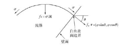 促使液體表面收縮的力叫做表面張力,其本質是分子力,是液體表面層由于分子引力不均衡而產生的沿表面作用于任一界線上的張力。表面張力的方向和液面相切,其合力沿著曲面法向方向。接觸角用來表示表面張力的方向。表面張力及接觸角如圖1所示。