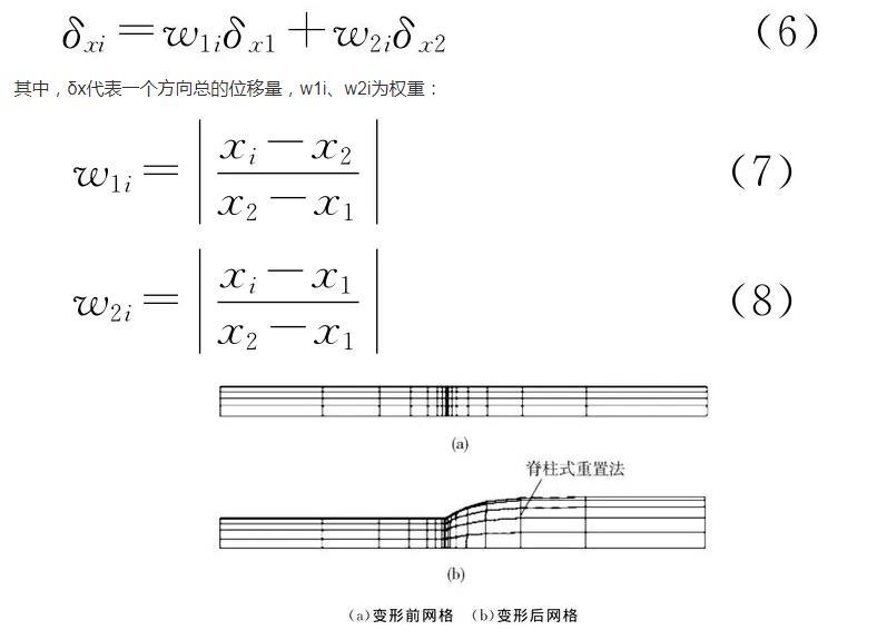 在數(shù)值模擬時,熔體自由表面在模擬的過程中會發(fā)生變形,自由表面的網格會因為自由表面位置的變化而發(fā)生變化。此時,需要采用網格重置技術。網格重置可以根據邊界點的位置的變化重新定位內部網格節(jié)點。Spine法是一種比較簡單,適用于二維擠出成型的網格重置方法。其網格節(jié)點是沿著線性進行重新組織的,如圖3所示。節(jié)點的位置確定是按照一維方式進行邏輯排列的,這就像是對二維平面進行切片,切片的方式是沿著自由表面或者移動邊界的法向方向,從而得到最終的網格。Spine法是線性組織的,并且在每個線段的端點處都有相應的節(jié)點。假設x1、x2是線段的2個端點。按照Spine法的規(guī)則,內部節(jié)點的位移數(shù)學表達式為: