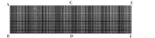 采用聚合物專用流體分析軟件Polyflow,對圓形截面的流道進行模擬分析,探討表面張力的尺寸效應及表面張力系數(shù)和接觸角對微擠出流場的影響。由于流道結構及流場的對稱性,本模擬采用軸對稱分析。模擬分析的流道尺寸及網格劃分如圖2所示。微通道尺寸AE=4×AB=1.2mm。網格采用四邊形結構單元。節(jié)點數(shù)量為3751,網格數(shù)量為3600。