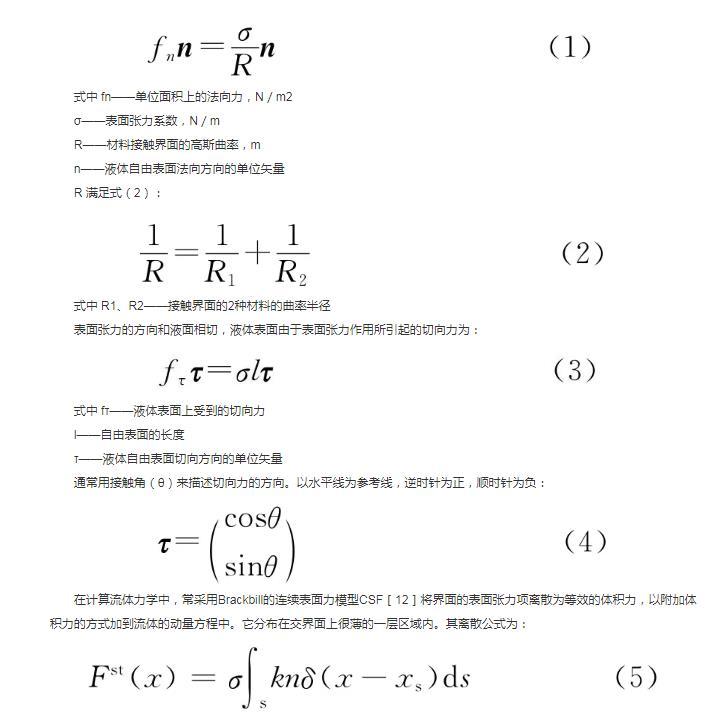 在計算流體力學中,常采用Brackbill的連續(xù)表面力模型CSF 將界面的表面張力項離散為等效的體積力,以附加體積力的方式加到流體的動量方程中。它分布在交界面上很薄的一層區(qū)域內。其離散公式為:
