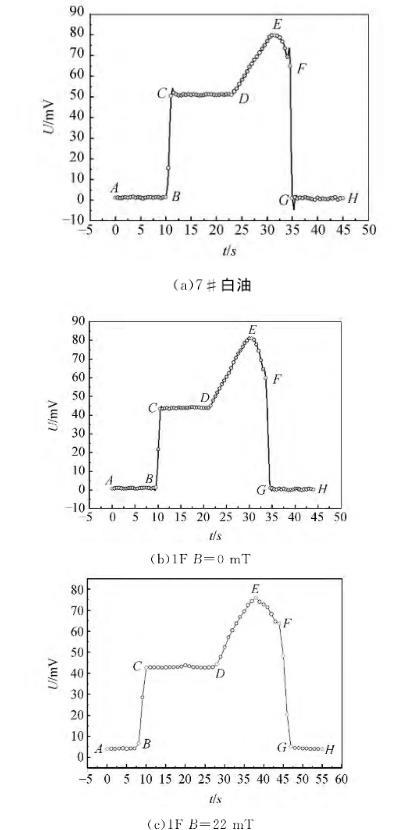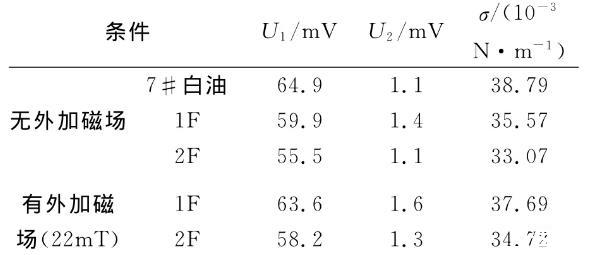 計算機(jī)實時在線采集了2種磁性液體及白油液膜拉脫過程中電壓隨時間的變化曲線,如圖4所示。從圖4可看到,3種液體的電壓變化規(guī)律一致,圖中F和G兩點(diǎn)是液膜破裂前后瞬間的電壓值,片狀吊環(huán)的內(nèi)外徑分別為33.10mm和34.69mm,根據(jù)(6)式即可計算出液體的表面張力。室溫(20±0.5)℃時各液體的表面張力見表2.7#白油的表面張力大于磁性液體,這主要是因為表面活性劑的加入降低了液體的表面張力。當(dāng)22mT的磁場作用于磁性液體時,磁性液體的表面張力增加,這主要是因為無外加磁場作用時,各磁性顆粒的磁矩方向雜亂無章,互相抵消,磁性液體不顯示宏觀磁性。當(dāng)外加磁場作用于磁性液體時,且磁場方向平行于切線方向的磁性液膜時,各磁性顆粒的磁矩方向轉(zhuǎn)向外加磁場方向,外加磁場增強(qiáng)了磁偶極子之間的相互作用,導(dǎo)致磁性液體的表面張力增加。