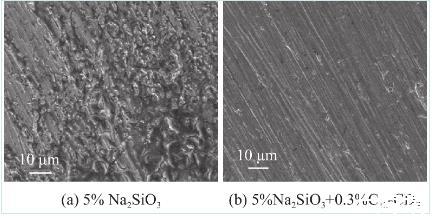 從圖7可以得知,5%Na2SiO3溶液的磨痕有較大片的剝落,磨痕深,說(shuō)明Na2SiO3聚集體在鋼球表面成膜,其磨損方式為黏著磨損;相比于前者,5%Na2SiO3+0.3%C12-CDS溶液的磨痕為細(xì)長(zhǎng)的淺犁溝,表明添加碳點(diǎn)后的磨損方式為磨粒磨損,且磨痕體積小。這是由于C12-CDS對(duì)硅酸鈉溶液的潤(rùn)滑機(jī)理是碳核表面的多羥基結(jié)構(gòu)和長(zhǎng)烷基鏈?zhǔn)蛊淠z束強(qiáng)烈吸附在金屬、井壁上形成憎水層隔絕兩摩擦面,通過(guò)氫鍵作用吸附包裹在硅酸聚集體表面形成球形顆粒造成滾動(dòng)摩擦。