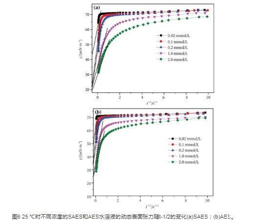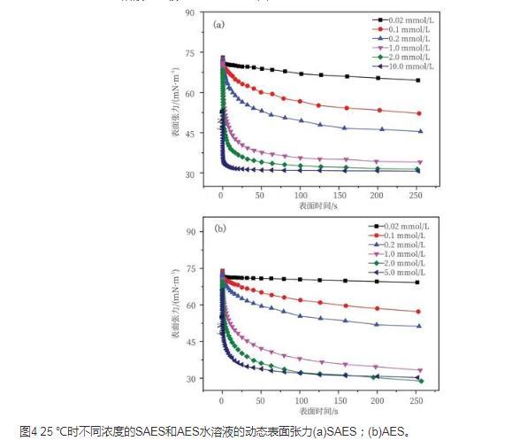 從圖4可以看出所測不同濃度不同表面活性劑的表面張力在初始階段均快速下降,一定時間后趨于平穩(wěn)狀態(tài)。這是因為動態(tài)表面張力測試過程中新形成的表面遠(yuǎn)偏離于平衡態(tài),吸附層離子的濃度很低,體相與吸附層的濃度差大,因此動態(tài)表面張力變化很大。隨著吸附的進(jìn)行,次表面濃度和表面濃度逐漸增大,擴(kuò)散和吸附的速度均逐漸降低,動態(tài)表面張力隨著吸附時間的增加而降低的趨勢也逐漸變得平緩。當(dāng)表面活性劑濃度增大時,表面張力的下降幅度和速度也隨之增大,而且相應(yīng)地縮短了到達(dá)平衡狀態(tài)的時間。這種隨體系濃度的增加達(dá)到平衡所需的時間越短的趨勢與已經(jīng)報道的一些烷基表面活性劑的結(jié)果是相一致的。在相同濃度下,SAES表面張力下降的速率大于AES,這是由于SO4-在碳?xì)滏溨虚g的化合物比在端點者擴(kuò)散速度快。