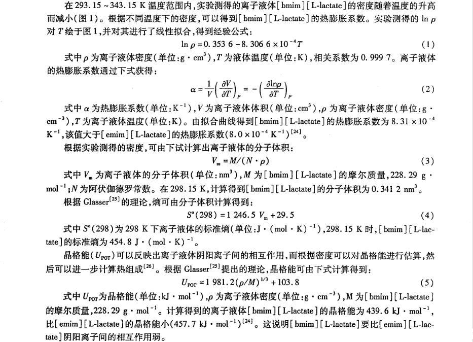 離子液體物理化學(xué)性質(zhì)的研究對離子液體的設(shè)計(jì)和應(yīng)用具有重要的指導(dǎo)作用,而對于離子液體與分子溶劑(例如水)的混合物性質(zhì)研究將會揭示該類液體的新的應(yīng)用。筆者在不同溫度下測定帶有手性陰離子的純離子液體1-丁基-3-甲基-咪唑乳酸鹽([bmim][L-lactate])及[bmim][L-lactate]+H2O二元混合物的密度和表面張力,并對其體積性質(zhì)和表面性質(zhì)進(jìn)行研究。以期進(jìn)一步豐富手性離子液體與分子溶劑二元混合物的物理化學(xué)性質(zhì)數(shù)據(jù),為其應(yīng)用提供更多的理論依據(jù)。