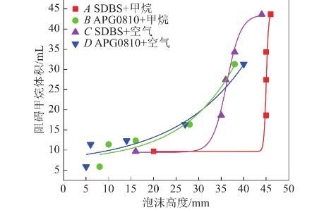 4)泡沫穩(wěn)定性是決定甲烷緩釋效應的關鍵因素,泡沫穩(wěn)定性越強,越能有效控制甲烷流動。可直接采取空氣-表面活性劑泡沫的各項參數(shù)表示泡沫性質。陰離子表面活性劑SDBS表現(xiàn)較好,泡沫穩(wěn)定性較強,隨著時間推移,SDBS也有比APG0810更好控制甲烷釋放的效果。質量分數(shù)為0.15%時,10 min內SDBS可以控制約占總通入甲烷體積87%的甲烷。120 min后仍可控制約占通入總體積49.16%的甲烷。