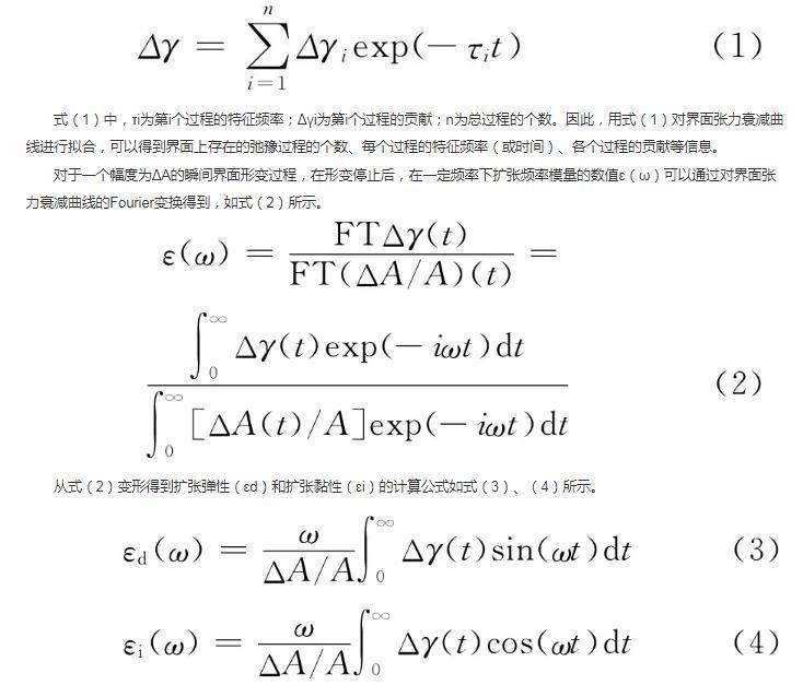 本研究中采用界面張力弛豫法,通過(guò)對(duì)受擾動(dòng)界面張力衰減曲線擬合獲得界面張力改變量隨時(shí)間變化的函數(shù)關(guān)系,再經(jīng)過(guò)Fourier變換,計(jì)算得到界面擴(kuò)張參數(shù)的全頻率譜,從而獲得界面上活性分子行為的信息。