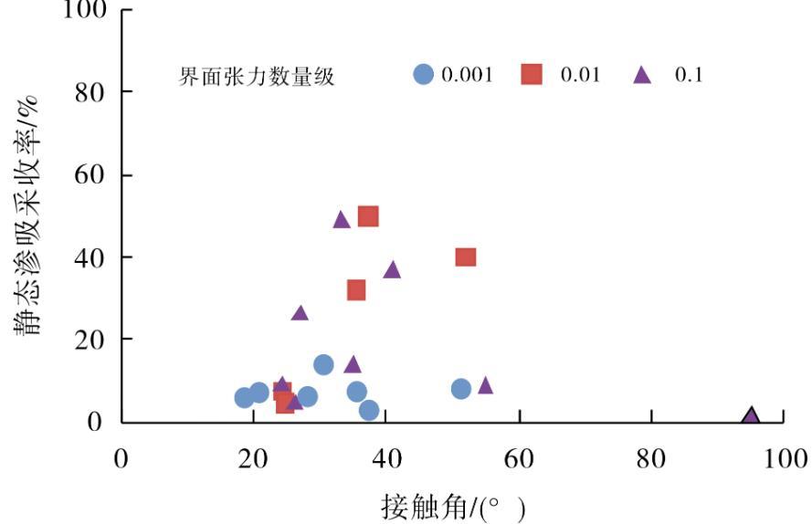 從圖1可以看出,當(dāng)界面張力小于0.01 mN·m-1時(shí),潤(rùn)濕性的改變不會(huì)顯著影響靜態(tài)滲吸采收率,說(shuō)明此范圍內(nèi)界面張力是制約靜態(tài)滲吸采收率的主要因素;當(dāng)界面張力大于0.01 mN·m-1時(shí),界面張力與靜態(tài)滲吸采收率之間沒有明顯規(guī)律,說(shuō)明此范圍內(nèi)滲吸采收率受到界面張力和潤(rùn)濕性的共同影響。