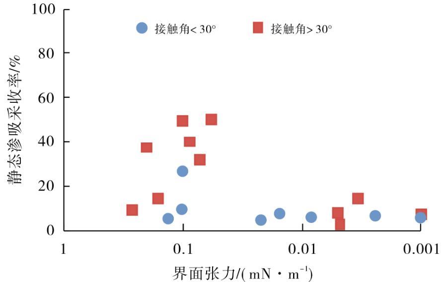 從圖1可知,界面張力大于0.01 mN·m-1時(shí),高接觸角時(shí)反而滲吸采收率整體更高。當(dāng)接觸角小于30°時(shí),靜態(tài)滲吸采收率最高為26.67%,平均為10.66%;當(dāng)接觸角大于30°時(shí),靜態(tài)滲吸采收率最高為50%,平均為33.15%。從圖2、表1可知,當(dāng)接觸角大于30°時(shí),滲吸液的界面張力平均為0.096 mN·m-1;當(dāng)接觸角小于30°時(shí),界面張力則減小到0.043 mN·m-1,這是由于低的接觸角需要更高的表面活性劑濃度(接觸角小于30°時(shí),表面活性劑濃度平均為0.259%;接觸角大于30°時(shí),表面活性劑濃度平均為0.190%),從而導(dǎo)致界面張力降低。因此,化學(xué)滲吸時(shí)若使用表面活性劑類潤(rùn)濕劑,應(yīng)使用合適的濃度,避免為了追求低接觸角導(dǎo)致界面張力過(guò)小。
