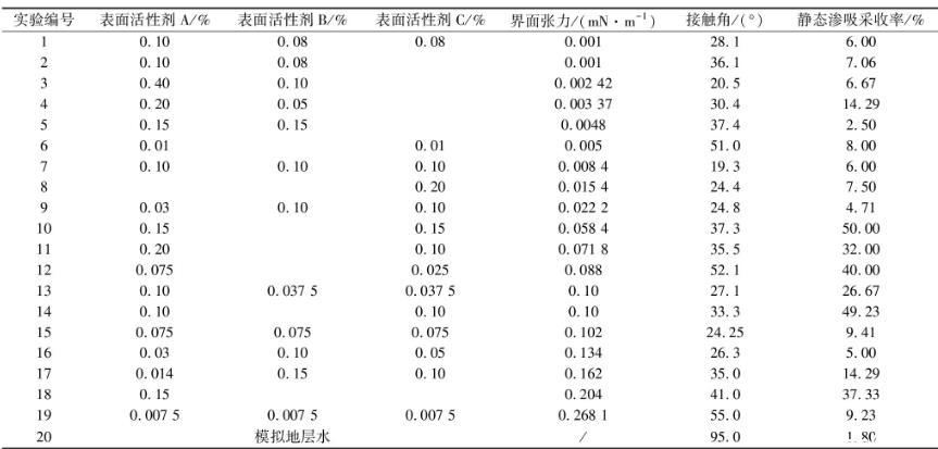 根據(jù)國(guó)內(nèi)外學(xué)者的研究,滲吸液對(duì)滲吸的影響主要是改變油水界面張力、潤(rùn)濕性、乳化性和pH值。乳化性主要是通過(guò)乳化分散,從而增強(qiáng)油滴在巖心孔道內(nèi)的流動(dòng)能力;pH值則主要是影響滲吸液的乳化能力。本次實(shí)驗(yàn)采取靜態(tài)滲吸的方式,乳化性的作用相對(duì)較小,故滲吸液配制指標(biāo)為界面張力與潤(rùn)濕性。