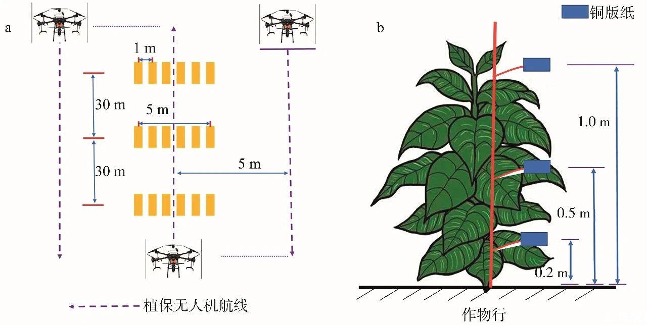 試驗(yàn)時(shí)無人機(jī)采用常規(guī)往復(fù)施藥模式進(jìn)行噴霧作業(yè),各條航線之間間隔為5.0 m,試驗(yàn)地塊開闊無遮擋,且煙草長(zhǎng)勢(shì)較為一致。試驗(yàn)前,在各處理小區(qū)中間地帶布置3排間隔為30.0 m的霧滴采集帶,每條霧滴采集帶含6個(gè)霧滴采集點(diǎn),每個(gè)采集點(diǎn)間隔1.0 m,總長(zhǎng)度5.0 m(圖1a)。每個(gè)霧滴采集點(diǎn)處插一根采樣桿,用雙頭夾將銅版紙固定在采樣桿上。設(shè)置上、中、下3層采樣位置,分別距地面1.0、0.5和0.2 m(圖1b)。用于測(cè)定煙草上、中、下冠層的霧滴密度和覆蓋率。噴霧結(jié)束后,待銅版紙上的霧滴自然晾干后收取并裝入自封袋帶回實(shí)驗(yàn)室。