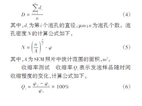 其中,A為SEM照片中統(tǒng)計(jì)范圍的面積,m2。收縮率測試收縮率Qi表示發(fā)泡樣品隨時(shí)間收縮程度的變化,計(jì)算公式如下。
