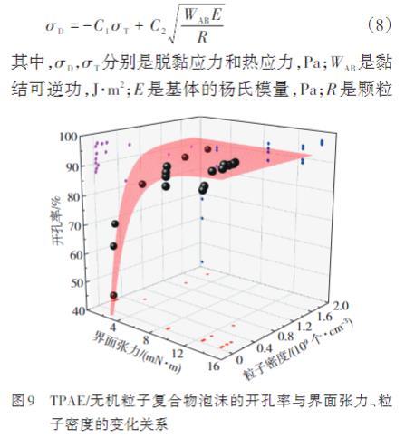 無機(jī)粒子與TPAE具有較高界面張力,并且粒子在TPAE基體中的分布密度較大時(shí),復(fù)合物傾向于形成具有更高開孔率的泡沫。其中對(duì)于TPAE/CaSiO3復(fù)合物,CaSiO3的團(tuán)聚現(xiàn)象導(dǎo)致的粒子尺寸增加也對(duì)泡沫的開孔率產(chǎn)生改善效果。此現(xiàn)象的理論依據(jù)可追溯至Vollenberg和Heikkinen提出的關(guān)于脫黏所需起始應(yīng)力的公式(8)