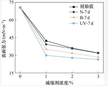 據(jù)以往研究,SRA在水泥基材料表面的吸附率通常在10%以下,90%以上的SRA分子溶于溶劑中(包含吸附在氣液界面上的部分)。因此,SRA減縮的理論基礎(chǔ)主要是毛細管張力理論。為了進一步探索減縮劑在強紫外線輻射環(huán)境下的作用機理,測試了減縮劑溶液的初始表面張力,以及溶液經(jīng)過3種不同環(huán)境(N,UV,B)處理7 d后的表面張力。試驗結(jié)果如圖8所示。