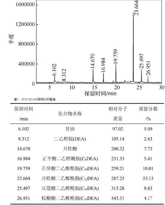 取一定量的GYD,用甲醇作溶劑,將其稀釋至約0.4%的質量分數(shù)后,進行GC-MS全掃描分析,得總離子流色譜圖見圖1。用氣相色譜數(shù)據(jù)處理系統(tǒng),以峰面積歸一法測得其中各組分的相對質量分數(shù),分析結果見表2。從表2可以看出,GYD是一種組成復雜的烷基醇酰胺混合物,主要包括不同碳數(shù)脂肪酸二乙醇酰胺和剩余原料甘油、二乙醇胺、月桂酸等。其中,月桂酸二乙醇酰胺相對含量最高為55.13%。