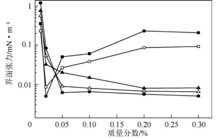 圖2不同烷醇酰胺油/水界面張力穩(wěn)定值隨質量分數(shù)的變化曲線