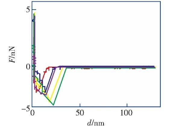 筆者利用原子力顯微鏡實驗測量了HOPG表面在醇-水替換前后的力距離曲線,發(fā)現(xiàn)醇-水替換前進針曲線的跳進距離小于5 nm,滿足DLVO理論;而在醇-水替換后納米氣泡覆蓋率為21.8%的情況下,進針曲線的跳進距離均大于10 nm,不能再用DLVO理論解釋,證明了IGE與納米氣泡共存這一現(xiàn)象。根據(jù)改進的Laplace-Young方程,結(jié)合文獻中對納米氣泡線張力值的計算結(jié)果,分析負的線張力對過渡區(qū)內(nèi)局部表面張力及局部固-液界面的影響,導(dǎo)致納米氣泡的接觸角反常小的原因之一。分析并討論雜質(zhì)對納米氣泡接觸角的影響,指出IGE與納米氣泡共存、線張力及雜質(zhì)影響的共同作用是導(dǎo)致納米氣泡接觸角“反常小”的原因。