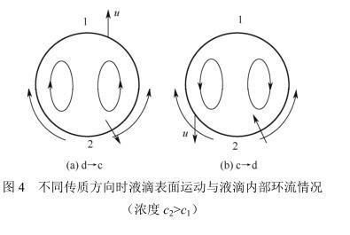 傳質方向對分散相滯存率的影響是由于Marangoni效應影響液滴破碎和聚并引起的。圖2和圖3中傳質方向為d→c的分散相滯存率遠高于傳質方向c→d的,原因在于本實驗所用的正丁醇-丁二酸-水體系是界面張力隨濃度增加而減小的體系(即?γ/?c<0)。在?γ/?c<0體系的d→c傳質過程中[如圖4(a)所示],界面張力梯度導致液滴表面的運動方向與液滴內部環(huán)流方向相同,有利于液滴的破碎。而c→d的傳質過程[如圖4(b)所示],界面張力梯度的方向不變,但液滴內部環(huán)流方向卻恰好相反,內部與外部兩種力量相互抵消,液滴相對較穩(wěn)定,破碎的概率大大減小。所以,d→c的分散相滯存率明顯高于相反方向。