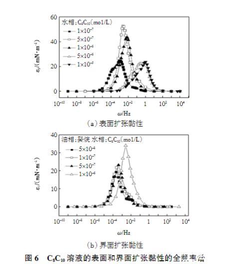 (2)對于表面吸附膜,界面分子重排的膜內(nèi)過程控制膜性質。羥基鄰位烷基鏈越長,分子間相互作用越強,表面上主控的弛豫過程的特征頻率越低。C10C8表現(xiàn)出更高的極限擴張彈性和擴張黏性最大值。