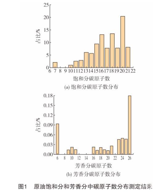 疏水端擴散進入原油的能力對表面活性劑在油水界面吸附,降低油水界面張力有直接影響。根據(jù)“相似相溶”原理,表面活性劑疏水端擴散進入原油的能力和其是否與原油中低極性組分(即飽和分和芳香分)具有相似結構密切相關。因此,測定原油中飽和分和芳香分的碳原子數(shù)分布,對快速篩選驅油用表面活性劑具有指導意義。