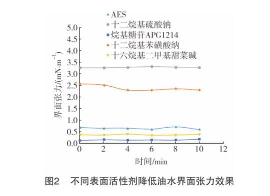圖2為不同表面活性劑降低油水界面張力的情況。從圖2可知,在5種表面活性劑質量分數(shù)均為0.2%的情況下,十六烷基二甲基甜菜堿和烷基糖苷APG1214效果最好,分別能將油水界面張力降至0.38 mN/m和0.17 mN/m,低于0.50 mN/m。這是因為原油飽和分和芳香分中C12~C16組分所占比例大,使得這兩種表面活性劑的疏水端碳原子數(shù)與其匹配較好,根據(jù)“相似相溶”原理,這兩種表面活性劑疏水端擴散進入油相的能力較強,因而降低油水界面張力的效果更好。