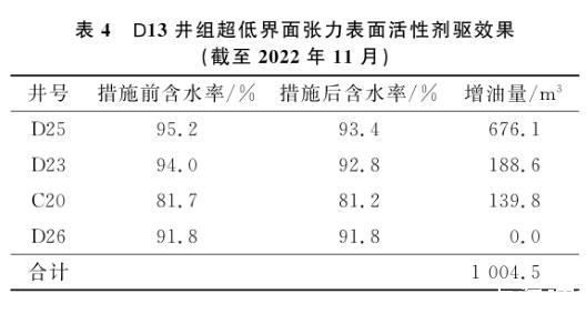 油藏評(píng)估結(jié)果顯示,D13井所控區(qū)域剩余可采儲(chǔ)量約6.7×104m3,剩余可采儲(chǔ)量較大。為挖掘該井所控區(qū)域油藏潛力,2022年4月開始對(duì)該井進(jìn)行超低界面張力表面活性劑驅(qū)油先導(dǎo)性試驗(yàn),2022年10月結(jié)束,共計(jì)注入表面活性劑溶液3 600 m3。考慮到滯留損失,試驗(yàn)將表面活性劑質(zhì)量分?jǐn)?shù)設(shè)計(jì)為0.3%。在注入過程中,注入壓力由8.9 MPa逐漸上升至10.2 MPa,分析認(rèn)為表面活性劑在地層中將剩余油乳化,乳化形成的油滴產(chǎn)生疊加的賈敏效應(yīng)所致。從表3的試驗(yàn)結(jié)果可知,截至2022年11月,施工結(jié)束1個(gè)月后,D13井對(duì)應(yīng)4口生產(chǎn)井中,除D26井因注采井距相對(duì)較遠(yuǎn),尚未見效外,其余3口井均已開始逐漸見效。見效井含水率下降0.5%~1.8%,1個(gè)月內(nèi)已實(shí)現(xiàn)在水驅(qū)基礎(chǔ)上增油1 004.5 m3,這說明超低界面張力表面活性劑能實(shí)現(xiàn)剩余油的有效啟動(dòng)。