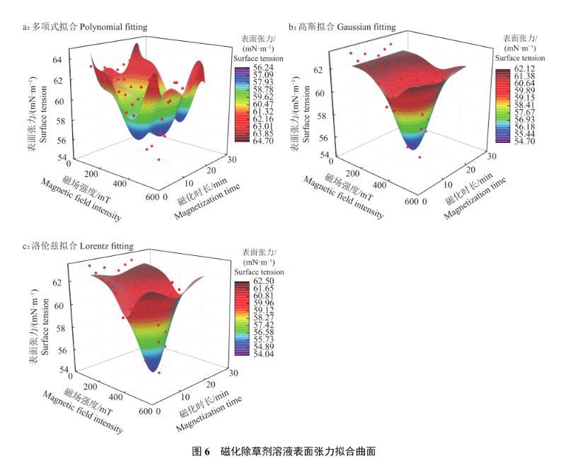 結(jié)合觀測(cè)3種擬合模型的曲面圖,得出洛倫茲擬合模型最優(yōu)(圖6)。除草劑溶液表面張力與磁場(chǎng)強(qiáng)度和磁化時(shí)長(zhǎng)的關(guān)系式見(jiàn)公式(4),為研究磁化作用對(duì)除草劑溶液表面張力的影響提供理論參考。