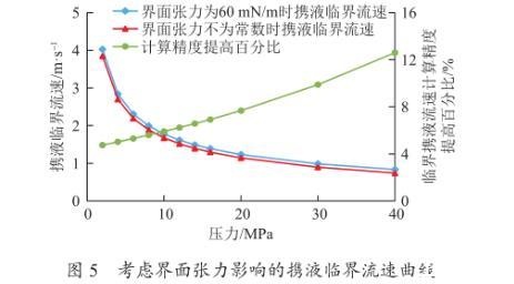 (1)界面張力對攜液臨界流量影響。如圖5所示為氣體相對密度為0.7,溫度為100℃時,利用新模型計算當界面張力為常數(60 mN/m)和界面張力隨壓力變化時不同壓力下的攜液臨界流速。考慮界面張力變化的攜液臨界流速要比界面張力為常數時的小,計算精度更高。且隨著壓力的增大,攜液臨界流速的計算精度提高百分比,逐漸從4%上升至12.5%,平均提高了8%。