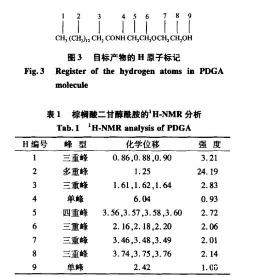 1)以四氫呋喃作溶劑,在氧化鎂存在下,通過棕櫚酸酰氯和二甘醇胺在0~5℃下反應(yīng)可以合成棕櫚酸二甘醇酰胺。在優(yōu)化反應(yīng)條件下產(chǎn)率可達到95%。經(jīng)紅外、質(zhì)譜、核磁等表征,合成產(chǎn)物與目標產(chǎn)物的分子結(jié)構(gòu)相符,為一種單一化合物。