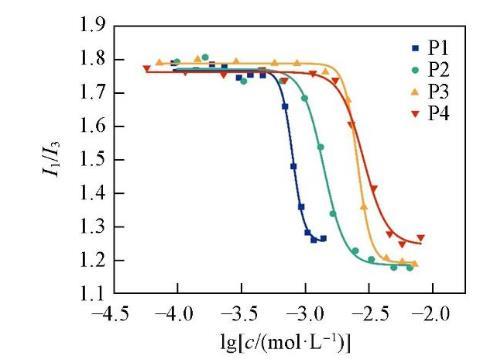 由圖3可見,當(dāng)表面活性劑的濃度較低時,I1/I3在1.70——1.80之間波動;當(dāng)表面活性劑濃度逐漸增加至cmc時,I1/I3值急劇下降,說明表面活性劑分子開始形成膠束,使得芘分子轉(zhuǎn)移至疏水膠束內(nèi),芘分子所處的環(huán)境極性發(fā)生突變;在較高表面活性劑濃度下,I1/I3值趨于穩(wěn)定,這是由于芘分子已經(jīng)完全處于膠束中,所處的環(huán)境極性不再發(fā)生變化。通過Boltzmann方程擬合得到表面活性劑P1,P2,P3和P4的cmc值分別為7.96×10-4,1.39×10-3,2.57×10-3和2.85×10-3 mol/L。結(jié)果表明,隨著聚氧乙烯鏈長度的增加,cmc逐漸增大。采用熒光法測得的cmc與采用表面張力法測得的cmc數(shù)值接近且變化趨勢一致。
