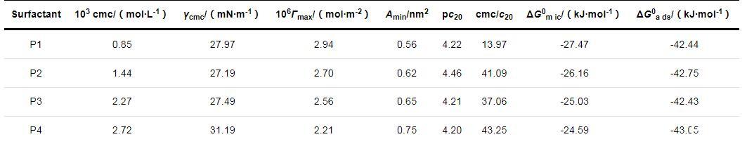利用ΔG0a ds和ΔG0m ic表征表面活性劑的熱力學(xué)性質(zhì)。P1,P2,P3和P4的ΔG0a ds和ΔG0m ic均小于0,說明表面活性劑在氣/液界面層上的吸附行為以及在水溶液中形成膠束的行為是自發(fā)進行的。4種表面活性劑的ΔG0a ds均小于ΔG0m ic,表明表面活性劑分子在溶液中會先形成吸附層,當(dāng)氣/液界面吸附達到飽和狀態(tài)后才開始在溶液內(nèi)部形成膠束聚集體。