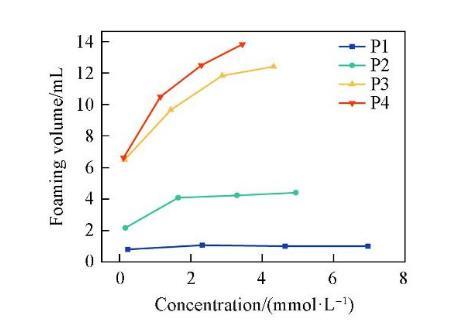 圖6示出4種表面活性劑泡沫穩(wěn)定性隨濃度的變化情況。泡沫穩(wěn)定性隨著濃度的增加先升高至最大值后又降低。這是因?yàn)楸砻婊钚詣┑奈綄?dǎo)致了Gibbs-Marangoni效應(yīng)。當(dāng)液膜受到?jīng)_擊局部變薄時(shí),產(chǎn)生表面張力梯度,導(dǎo)致鄰近區(qū)域吸附的表面活性劑攜帶水化層向薄膜處遷移,以恢復(fù)原來(lái)的表面張力并修復(fù)液膜。在較低濃度時(shí),表面活性劑濃度的增加使得Gibbs-Marangoni效應(yīng)隨之加強(qiáng),進(jìn)而有效阻止液膜變薄,增加泡沫的穩(wěn)定性。當(dāng)濃度大于cmc后,溶液中的表面活性劑分子能夠快速吸附在界面處,使得Gibbs-Marangoni效應(yīng)減弱,泡沫穩(wěn)定性降低。在4種表面活性劑中,P2的泡沫穩(wěn)定性最強(qiáng),這可能是由于分子在空氣/水界面上排列最緊密,形成的液膜強(qiáng)度更大,因此泡沫不易發(fā)生破裂。