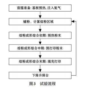 的當量直徑,μm;ni為當量直徑為di的顆粒的個數(shù)。計算可知,試驗粉末的算術平均直徑為65μm。再取100 mL的試驗粉料稱重,凈重為0.40 kg;計算得到試驗粉末體積孔隙率ε為0.49,因此粉末顆粒并非最緊密堆積狀態(tài)。熔粉制備了橫截面積為5 cm2,長5 cm的圓棒,每層鋪粉0.10 mm,實驗流程如圖3所示。