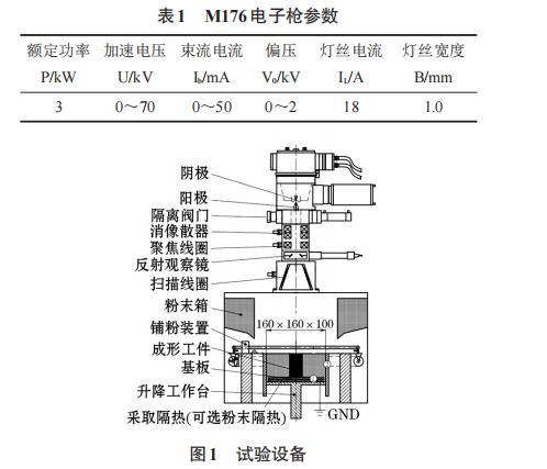 試驗設備為桂林獅達公司自制的THDW-3型電子束熔粉打印機,電子槍的型號為M176,電子槍真空度為5×10-2Pa,熔粉成形室注入氦氣之后的真空度為0.3 Pa。電子槍的參數(shù)如表1所示。成形設備如圖1所示。