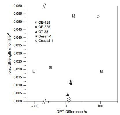 圖5 液滴穿透時間(DPT)的差異 鹽溶液和水,與鹽的離子強(qiáng)度 解決方案。