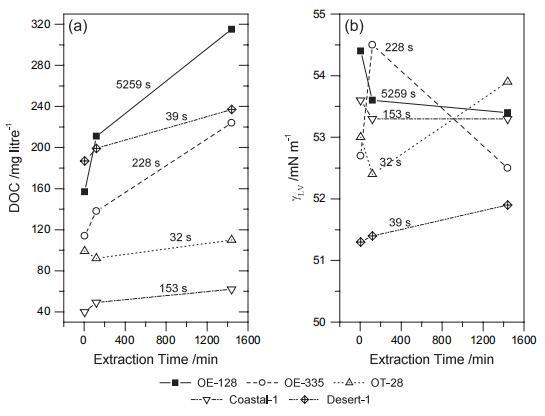 圖2 土壤溶解有機(jī)碳(DOC)含量(a)和表面張力(γLV)(b) 提取作為提取時間的函數(shù)。 水 以秒為單位的液滴穿透時間 (WDPT) 是 標(biāo)在面板上。
