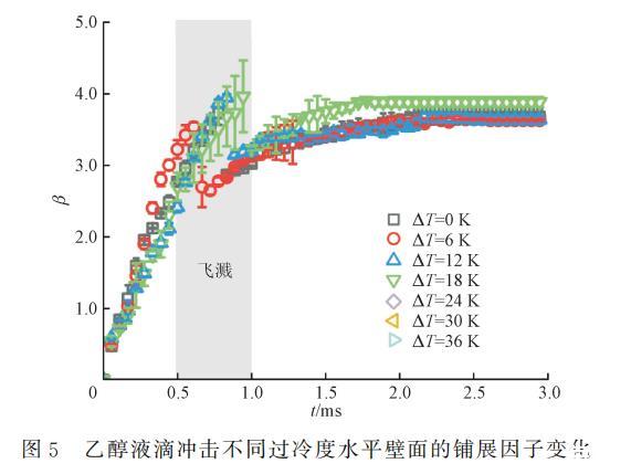 為了探究水平壁面過冷度對液滴沖擊的影響機制,定義無量綱鋪展因子β=D(t)/D0,其中D(t)為液滴每一時刻的直徑,Dmax為液滴能達到的最大鋪展直徑,對應(yīng)的最大鋪展因子為βmax=Dmax/D0。圖5展示了不同水平壁面過冷度下,乙醇液滴沖擊水平壁面的鋪展因子β隨時間的變化曲線。可以看出,乙醇液滴沖擊不同過冷度水平壁面均在1.0ms內(nèi)發(fā)生破碎-飛濺,在這段時間內(nèi),鋪展速率近似為線性,在飛濺后,β突然減小,隨后鋪展因子繼續(xù)增,鋪展速率逐漸減小,最終趨于0,液滴形態(tài)不再發(fā)生變化。