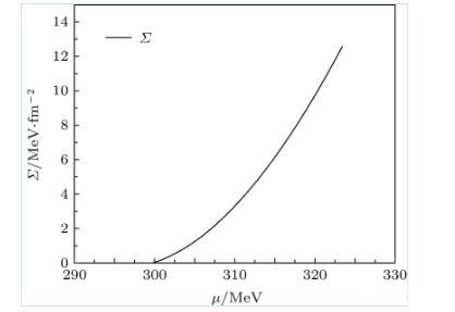 利用薄壁近似,圖2給出了當(dāng)T=Tc時(shí),夸克強(qiáng)子一級(jí)相變的表面張力隨夸克化學(xué)勢(shì)的變化。可知在一級(jí)相變區(qū)域,當(dāng)化學(xué)勢(shì)增大時(shí),強(qiáng)子相的表面張力也隨著化學(xué)勢(shì)增大。當(dāng)溫度接近零時(shí),強(qiáng)子夸克相變的表面張力約為12.6 MeV/fm2.在T→0的情況,本文理論預(yù)言與文獻(xiàn)一致,但該文獻(xiàn)只是考慮T=0的冷夸克物質(zhì)的夸克強(qiáng)子一級(jí)相變。