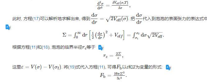 在偽真空的環(huán)境下,大小不一的真真空泡泡,由于量子漲落和熱漲落隨機(jī)出現(xiàn)并消失,直至泡泡的半徑大于等于臨界半徑,然后這些泡泡就會(huì)一直膨脹下去,完成一級(jí)相變的相變過(guò)程,并把多余的體系自由能以相變潛熱的形式釋放到環(huán)境中。基于這個(gè)機(jī)制,單位時(shí)間單位體積的臨界泡泡成核率可以表示為