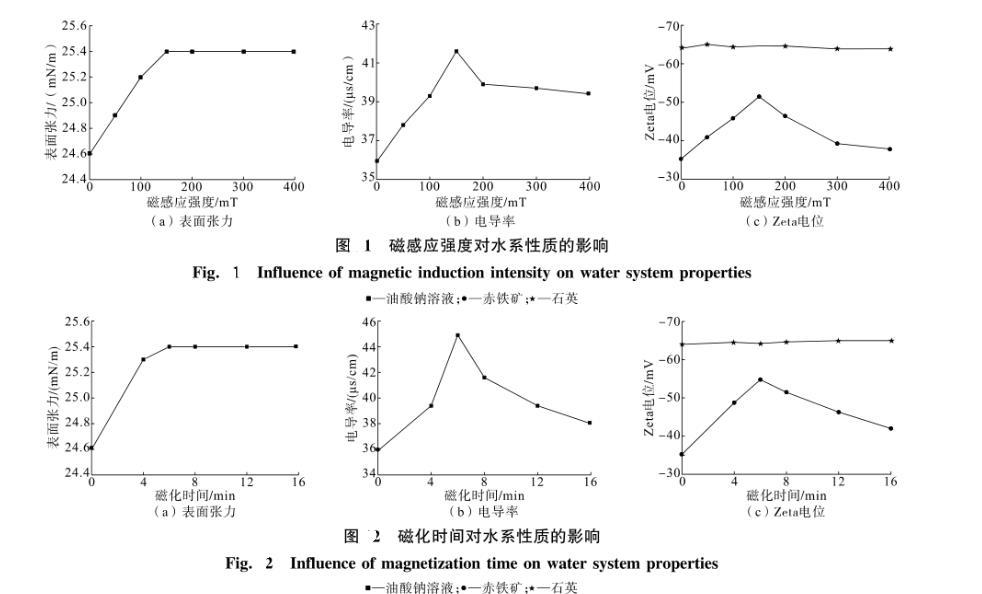 (2)表面張力、電導(dǎo)率和Zeta電位測試結(jié)果表明,磁化處理后溶液中油酸鈉離子濃度增加,油酸根離子在赤鐵礦表面的吸附增強,有利于赤鐵礦和石英的浮選分離。