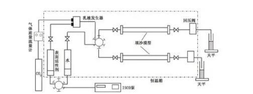 實(shí)驗(yàn)步驟:①利用不同目數(shù)的石英砂填制滲透率約為400×10-3μm2的填砂管模型,初測(cè)氣測(cè)滲透率,滿足要求后測(cè)定水測(cè)滲透率,測(cè)定滲透率為(350~450)×10-3μm2時(shí)合格,可進(jìn)行下一步實(shí)驗(yàn),稱取巖心管干重M0;②利用真空泵對(duì)填砂管抽真空3 h,飽和水后稱取巖心管濕重M1,則孔隙體積V=(M1-M0)/ρW;③按照?qǐng)D2所示流程圖連接實(shí)驗(yàn)裝置,并依據(jù)實(shí)驗(yàn)方案設(shè)定恒溫箱溫度,恒溫4 h;④依據(jù)實(shí)驗(yàn)方案設(shè)定回壓,水驅(qū)時(shí)速度設(shè)定為1.5 mL/min,CO2乳液驅(qū)時(shí)表面活性劑水溶液及CO2注入速度分別設(shè)定為0.5和1 mL/min,即設(shè)定氣液比為2∶1;⑤實(shí)驗(yàn)過(guò)程中記錄注入端壓力變化;⑥并聯(lián)巖心驅(qū)替實(shí)驗(yàn)與單巖心驅(qū)替實(shí)驗(yàn)類似,總流量設(shè)定為5 mL/min。