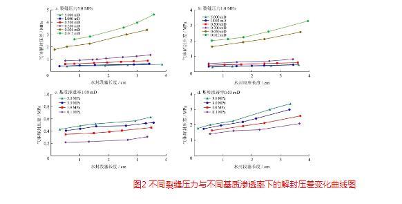 圖2不同裂縫壓力與不同基質(zhì)滲透率下的解封壓差變化曲線圖