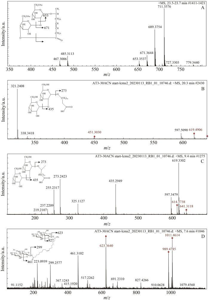 相比較而言,去乙酰化SLs同系物的保留時間較短,說明這些同系物的極性增大。其中,乙酰化SLs同系物的總離子流圖(圖1A)中保留時間為23.6 min處的峰的豐度最高,質(zhì)量分數(shù)為42.47%,其質(zhì)譜碎片如圖2A所示。質(zhì)荷比(m/z)為689.3754的峰為具有C18∶1單不飽和脂肪酸部分的二乙酰化內(nèi)酯型SLs的分子離子峰,m/z 711.3576為[M+Na]+峰,m/z 671.3644和653.3537分別為[M+H]+失去1個水分子和2個水分子的峰,m/z 485.3113和467.3006分別為[M+H]+失去1個己糖環(huán)和再失去1個水分子的峰。上述分析表明,保留時間為23.6 min的組分為帶有單不飽和度的C18脂肪酸鏈的雙乙酰化內(nèi)酯型SLs,即,17-L-[(2-O-β-D-吡喃葡萄糖基-β-D-吡喃葡萄糖基)-O-]-十八碳烯酸-1,4-內(nèi)酯-6′,6″-二乙酸酯。