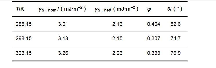 兩種成核機(jī)制時(shí)的固-液界面張力(γS,hom和γS,het)、形狀因子(φ)和接觸角(θ)的計(jì)算結(jié)果列于表2.可以看出,在同一溫度下,均相成核時(shí)的固-液界面張力大于非均相成核時(shí)的固-液界面張力;溫度對(duì)固-液界面張力的影響并不明顯,固-液界面張力只隨溫度的升高略有增加.
