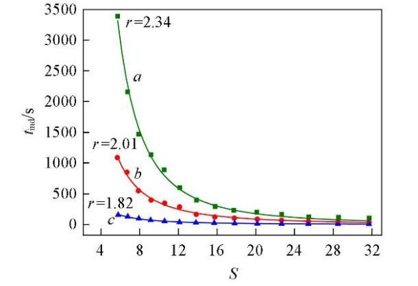 分別在288.15,298.15和323.15 K時(shí)研究了NaCl的添加對(duì)Li2CO3成核誘導(dǎo)期的影響,每組實(shí)驗(yàn)均在Cl?的超額含量(Y=0.5)的條件下進(jìn)行,結(jié)果見圖4.可知,在同一溫度下,Li2CO3的成核誘導(dǎo)期仍然隨過飽和度的增大而縮短;在同一過飽和度下,Li2CO3的成核誘導(dǎo)期隨溫度的升高而縮短,而且在添加NaCl(Y=0.5)后,溫度對(duì)Li2CO3成核誘導(dǎo)期的影響比未添加(Y=0)時(shí)更為顯著.如,在過飽和度S=5.76,溫度從288.15 K升高到323.15 K時(shí),添加NaCl后Li2CO3的成核誘導(dǎo)期縮短了73.01%,而未添加NaCl時(shí)Li2CO3的成核誘導(dǎo)期縮短了67.89%.