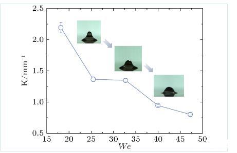 為了更加清晰地表明液滴撞擊的We對(duì)三種模態(tài)的影響,根據(jù)實(shí)驗(yàn)結(jié)果總結(jié)了撞擊We與電毛細(xì)力Cae的關(guān)系,如圖7所示。函數(shù)結(jié)果表明,第一模態(tài)可以發(fā)生在所有韋伯?dāng)?shù)內(nèi),并且隨著韋伯?dāng)?shù)的增加,第一模態(tài)的閾值電場也在不斷增加。第二模態(tài)的閾值電場范圍是三種模態(tài)中最小的,韋伯?dāng)?shù)越大時(shí)需要更強(qiáng)的電場才能產(chǎn)生第二模態(tài)。第三模態(tài)的閾值電場隨著韋伯?dāng)?shù)的增加也在不斷增大,只是液滴出現(xiàn)第三模態(tài)的電場范圍在減小。這可能是由于韋伯?dāng)?shù)的變化導(dǎo)致拉伸液滴形態(tài)的變化,從而影響了靜電力的強(qiáng)度。基于上述考慮,為了深入剖析三種模態(tài)閾值電場變化的原因,根據(jù)實(shí)驗(yàn)結(jié)果對(duì)無外加電場條件下液滴拉伸過程中韋伯?dāng)?shù)We與平均頂點(diǎn)曲率K(如式7所示)的關(guān)系進(jìn)行了討論,如圖8所示。從關(guān)系圖中可以看出,當(dāng)液滴處于回縮階段并達(dá)到最大拉伸高度時(shí),韋伯?dāng)?shù)的增加會(huì)伴隨著液滴頂部曲率半徑的增大,而曲率半徑的增大將會(huì)導(dǎo)致靜電力的相對(duì)減弱。